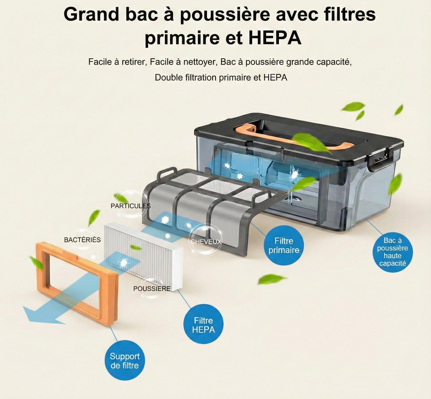 Le filtre primaire retient les cheveux et les grosses particules, tandis que le filtre HEPA capture les poussières fines et allergènes pour un air plus sain.